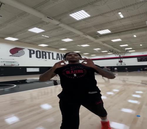 開拓者官方分享訓練花絮:楊瀚森雙手暴扣罰球訓練后搞怪互動